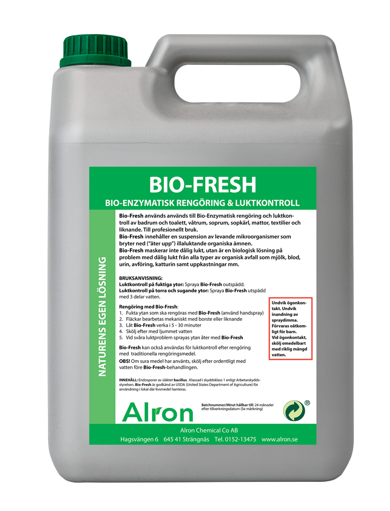 Mikrobiologiskt medel som innehåller en kombination av mikroorganismer, stabiliserade enzymer och biologiskt nedbrytbara luktämnen, som tillsammans ger en omedelbar såväl som långsiktig kontroll av dålig lukt från alla typer av organiskt avfall och spill (mjölk, uppkastning, urin, avföring, blod, sopor, etcetera). Lämpar sig ypperligt för rengöring av toaletter, badrum, soprum, sopkärl, mattor och textilbeklädda möbler. Bio-Fresh är naturens egen lösning på luktkontroll och är helt överlägsen alla andra alternativ ur miljösynpunkt.